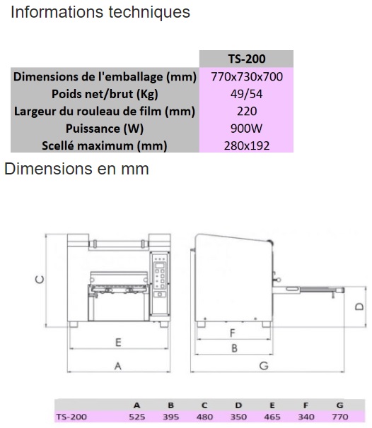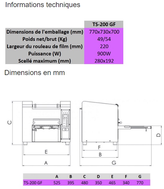 - Largeur de bobine de film : 220 mm.