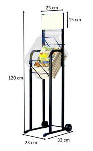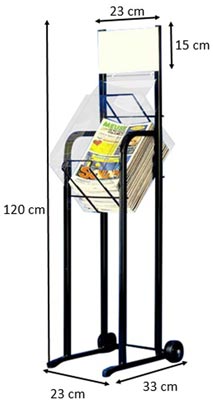 Les présentoirs souhaitaient devront être orange en métal, une hauteur totale de 125cm, la hauteur du bac pour poser les magazines serait de 65cm, la largeur de 35cm et 23cm de profondeur.