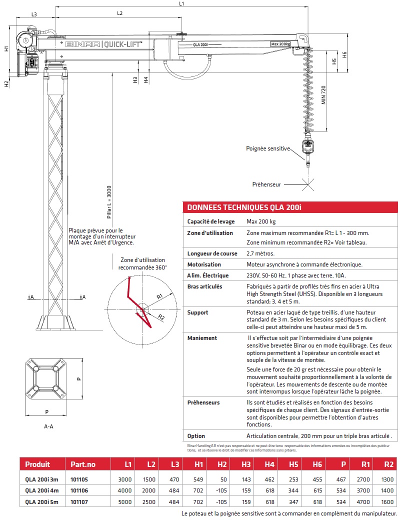 Ce bras manipulateur de charge permet de manipuler des charges jusqu'à 200 Kg.