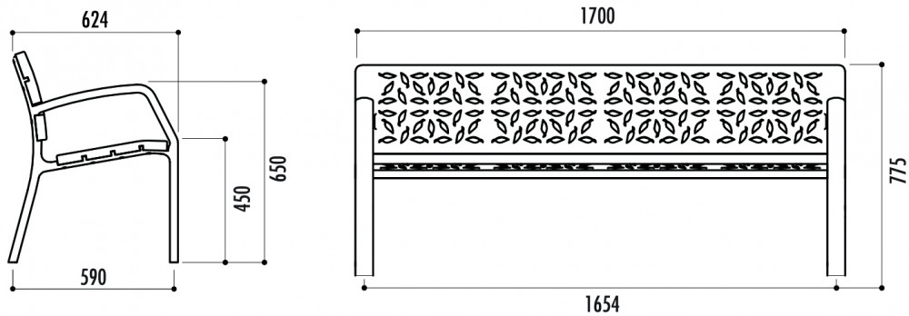 Ce banc public est monté sur 4 pieds perforés pour une fixation au sol par vis d’ancrage (non fournis).