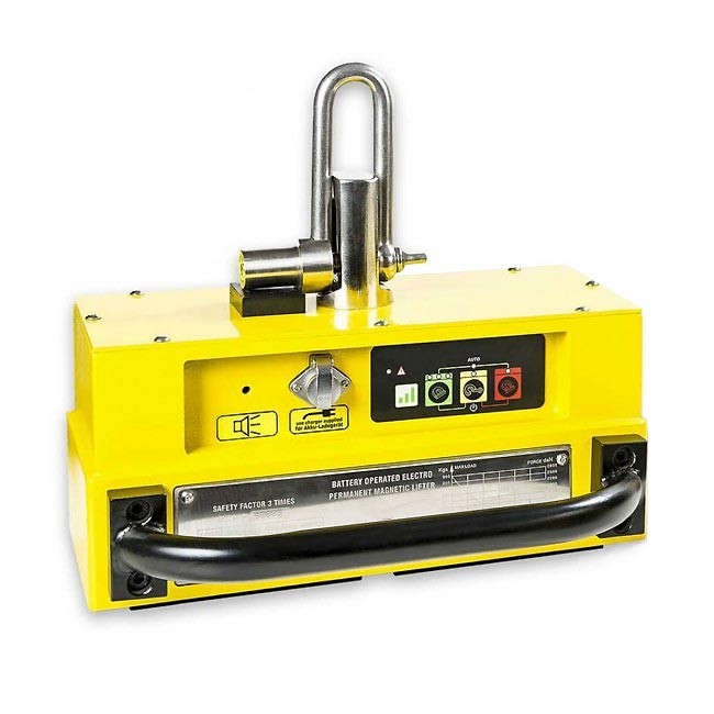 Cet électroaimant est conçu sur batterie pour le levage de charges plates et rondes.