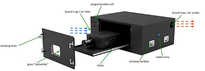 Chaque caisson est fabriqué sur mesure, en tenant compte des spécificités techniques de chaque projecteur, notamment la dissipation thermique (BTU/h), la puissance et le débit des ventilateurs.