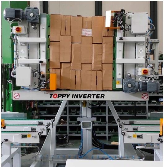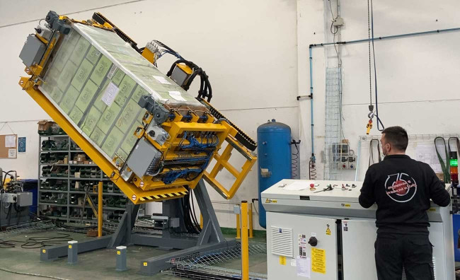 « Inverter Inline » est un transfereur de palette en ligne équipé de deux convoyeurs à rouleaux, un sur chaque plate-forme. Les rotations et le levage sont obtenus par système hydraulique. Ce système fonctionne 40 palettes / heure avec chaque taille de palette. A cela, il faut ajouter le temps de changement de taille de palette. (exemple : de 800×1200 mm à 1000×1200 mm et inversement).