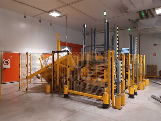Le système logistique de retournement palette « V-Shape » se compose d’un retouneur de palettes équipé d’un convoyeur placé sur la plate-forme, d’un magasin de palettes (adapté à tous les types de palettes) et d’un convoyeur à rouleaux. Les entrepôts de palettes sont équipés de convoyeurs à chaîne pour la collecte et la livraison des palettes. En plus de cela, le système est équipé d’un convoyeur à chaîne conduisant la palette vers le retourneur de palette «Toppy V‐Shape», pour le remplacement automatique de la palette. Chaque entrepôt de palettes est capable de gérer de nombreux types de palettes avec une capacité maximale de 15 unités.