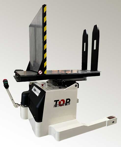 Le retourneur de palette mobile « Retriever » dispose d'un panneau de contrôle latéral qui contrôle toutes les phases du changement de palette. En quelques secondes, il est possible de remplacer la palette et en même temps d'accéder facilement à la palette et à la partie inférieure de la charge. De cette manière, il est possible de remplacer les produits endommagés également placés à la base de la charge sans gaspillage de ressources et avec des niveaux de sécurité plus élevés.