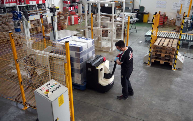 Le transfereur de palette « Easy Changer » est une station de changement palette innovante et compacte, intégrant un nouveau type d’empileur de palette. Le transfereur de palette « Easy Changer » effectue un double travail : il permet de remplacer la palette sans faire basculer la charge et de stocker la palette remplacée derrière la machine elle-même dans un distributeur de palettes spécial. Ce transfereur depalettes est entièrement automatique et équipé en standard de barrières de sécurité et de barrières immatérielles de sécurité.