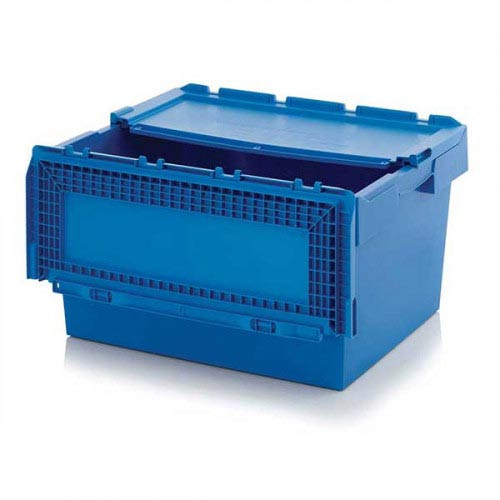 Le couvercle à charnière droit intégré à ce bac navette de transport en polypropylène assure une fermeture fiable, sans élément déporté à gérer ou à stocker séparément.