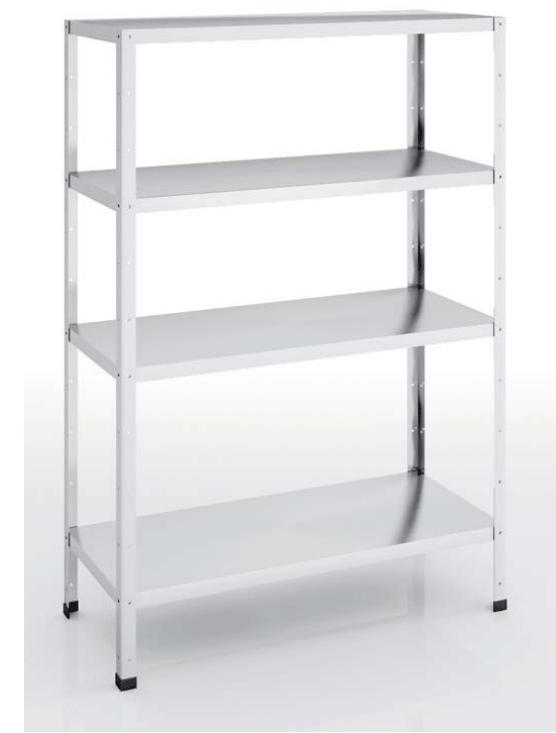 Ce rayonnage en inox est équipé de 4 étagères et de 4 montants avec un réglage de la hauteur des étagères tous les 150 mm.