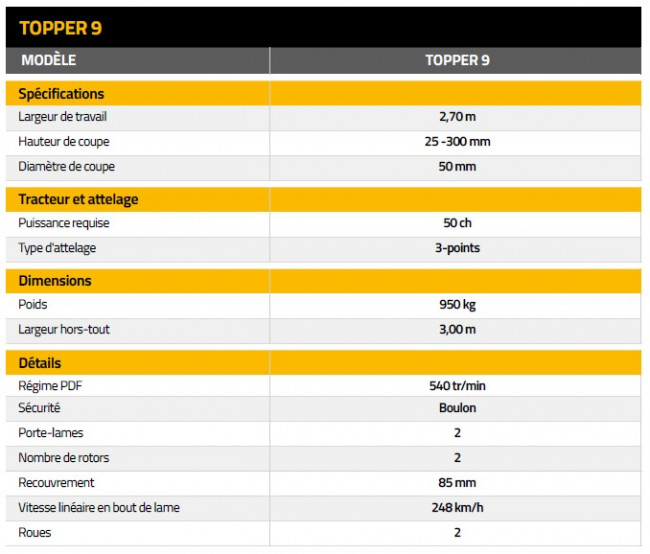 Avec un poids de 950 kg, le Topper 9 est une machine extrêmement robuste. Son plateau en acier renforcé, ses lames trempées et ses rideaux de chaînes de protection à l’avant et à l’arrière, améliorent la durabilité de la machine et en font un choix idéal pour les clients qui exigent le meilleur en matière de fiabilité.