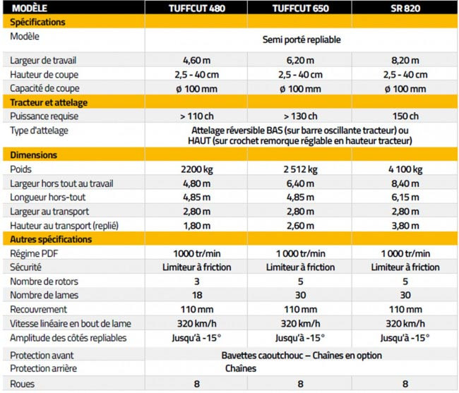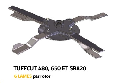 Les modèles Tuffcut 480, 650 et SR820 sont équipés de 6 lames par rotor avec disques anti-scalp. Ces 6 lames sont composées de 4 lames aspirantes qui redressent et coupent en même temps, et de 2 lames hacheuses supplémentaires accentuant la finesse de broyage.