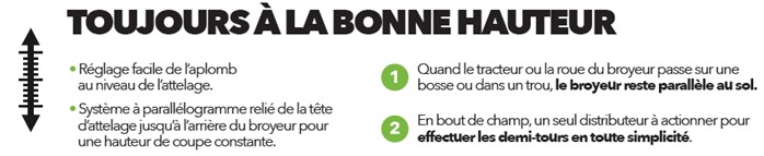 Le système de Levage par parallélogramme permet de faire passer le gyrobroyeur par-dessus les obstacles pour éviter une surcharge sur les lames et les boitiers.