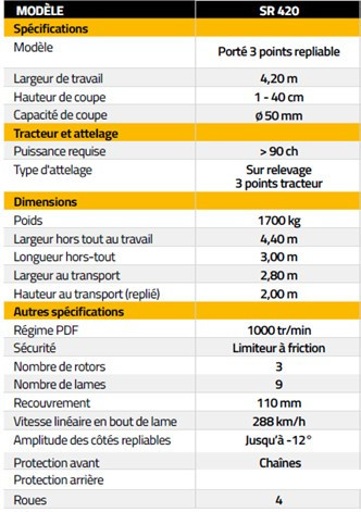Le SR420, propose 3 lames par rotor avec disques anti-scalp. Cet outil offre une largeur de broyage de 4,20 m.