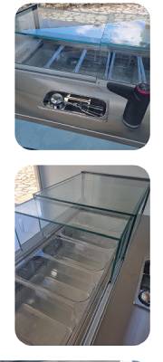 Vous profitez d’une vitrine à glace pour triporteur capable d’accueillir 5 bacs de 5 litres ou 10 bacs de 2,5 litres, ainsi que d’une réserve de 8 bacs de 5 litres.