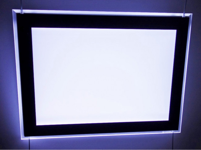 Porte affiche LED avec chassis noir et rebord biseauté.