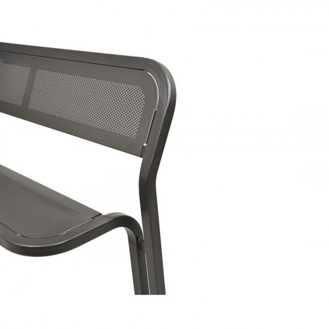 Longueur : 2000 mm Structure : tube acier 40 x 40 mm. Assise et dossier : tôle acier perforée de 2 mm Finition : peint sur zinc selon nos coloris Fixation : scellement direct.