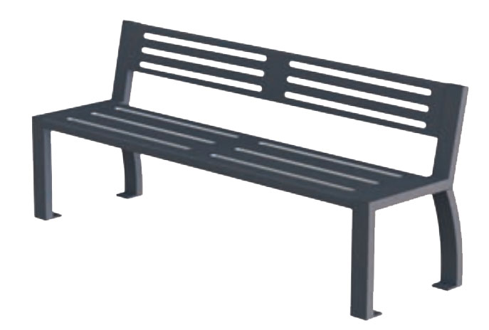 Composé d’une assise et dossier en tôle d'acier fixée avec des vis en inox, d'une longueur de 1800 mm et piétement de 200 mm avec une fixation à cheviller ou à sceller.