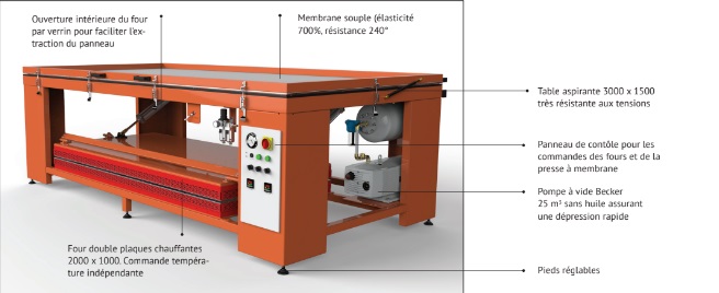 Cette Presse et Four pour thermoformage est la combinaison d’une presse sous vide et d’un four destinée aux menuisiers agenceurs.