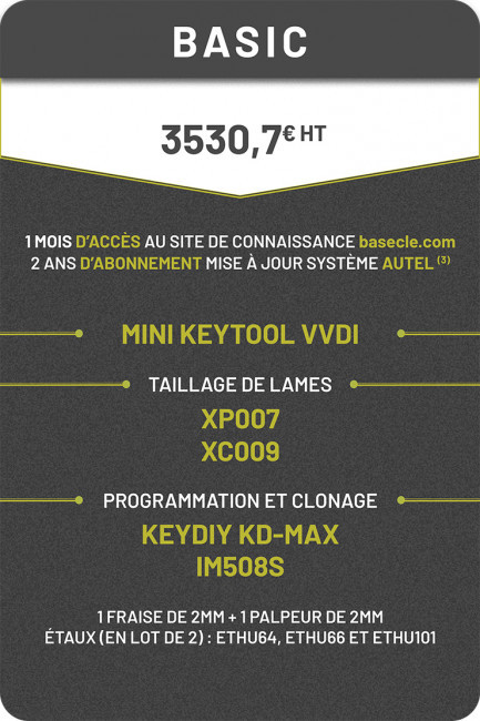 Découvrez notre offre complète de packaging pour le taillage de clés automobiles, conçue pour vous permettre d'opérer en toute autonomie et de répondre aux besoins de plus de 80 % des véhicules du parc automobile.
