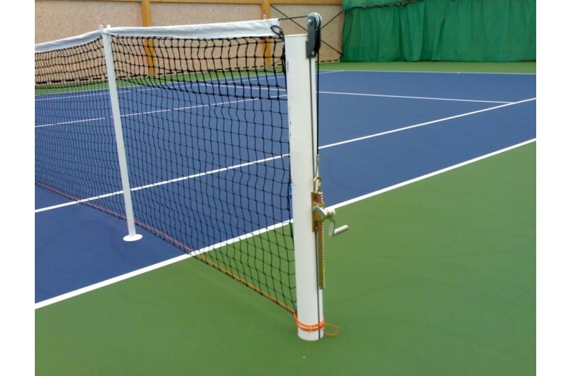 Tension du filet rectiligne par treuil à crémaillère, maintien des filets le long des poteaux par tiges coulissantes.