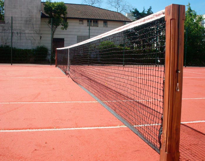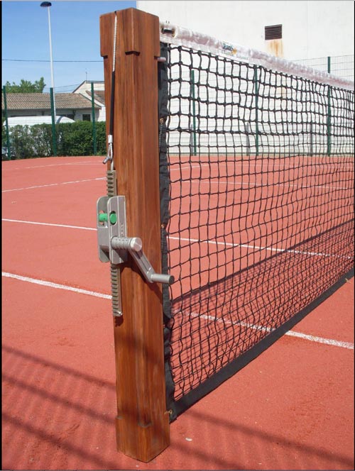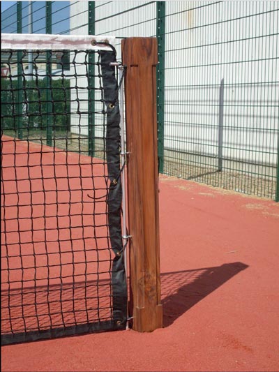 fourreaux en aluminium avec les anneaux vers l’intérieur du terrain et placer le filet sur les poteaux en passant le câble dans la roulette en partie haute puis mise en tension de l’ensemble.