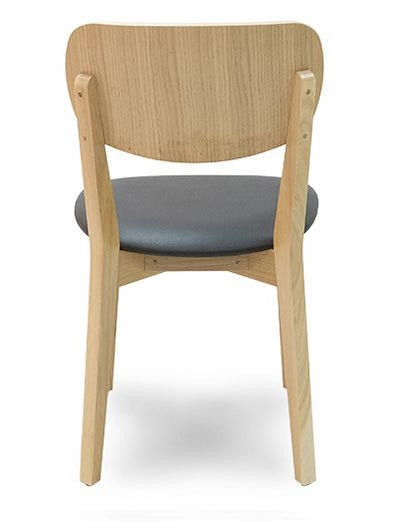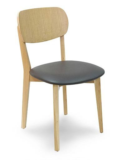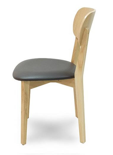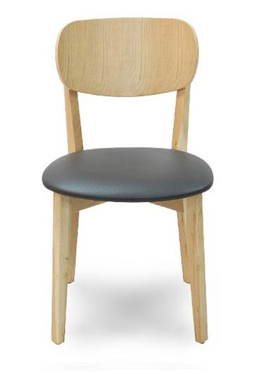 Elle est fabriquée en bois de hêtre finition verni Naturel, avec assise rembourrée, revêtue de vinyle gris foncé.