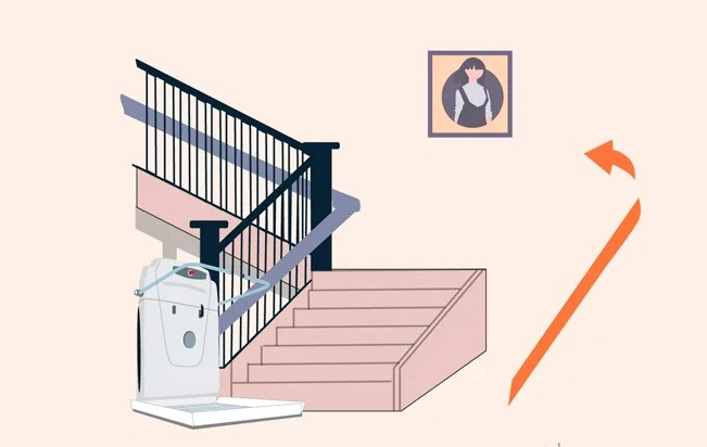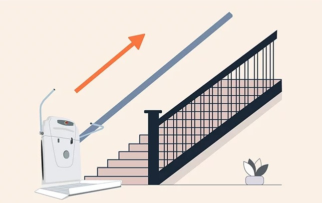 - Se déplace le long d’un rail suivant la pente de l’escalier fixé contre le mur ou sur piliers à même les marches