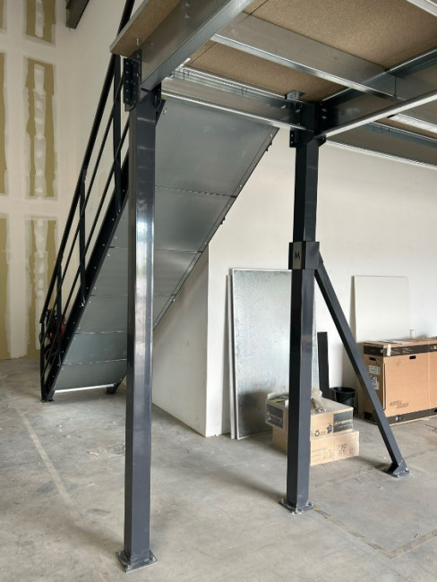 Un escalier industriel de 800 mm de largeur est inclus pour un accès facile à la mezzanine. Si nécessaire, un porte-à-faux peut également être ajouté.