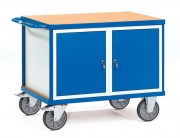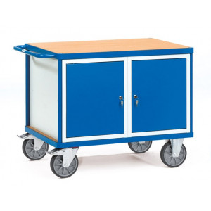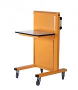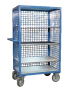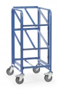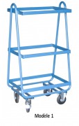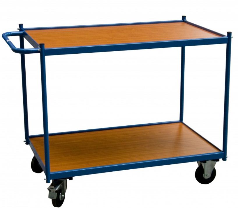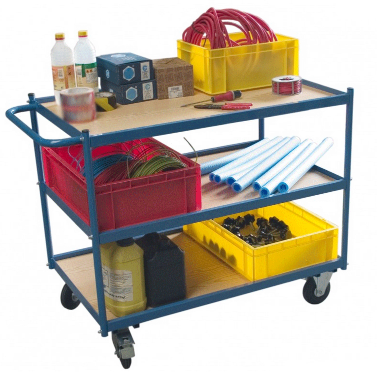 Équipé d'une barre de poussée, de 2 ou 3 plateaux en bois mélaminé épaisseur 19 mm et de 4 rouesTPE Ø 125 mm, 2 fixes + 2 pivotantes à frein.