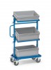 2 roues fixes et 2 roues pivotantes à bandage TPE, moyeu à roulement à billes. Freins sur roues pivotantes conformément à la Norme EN 1757-3