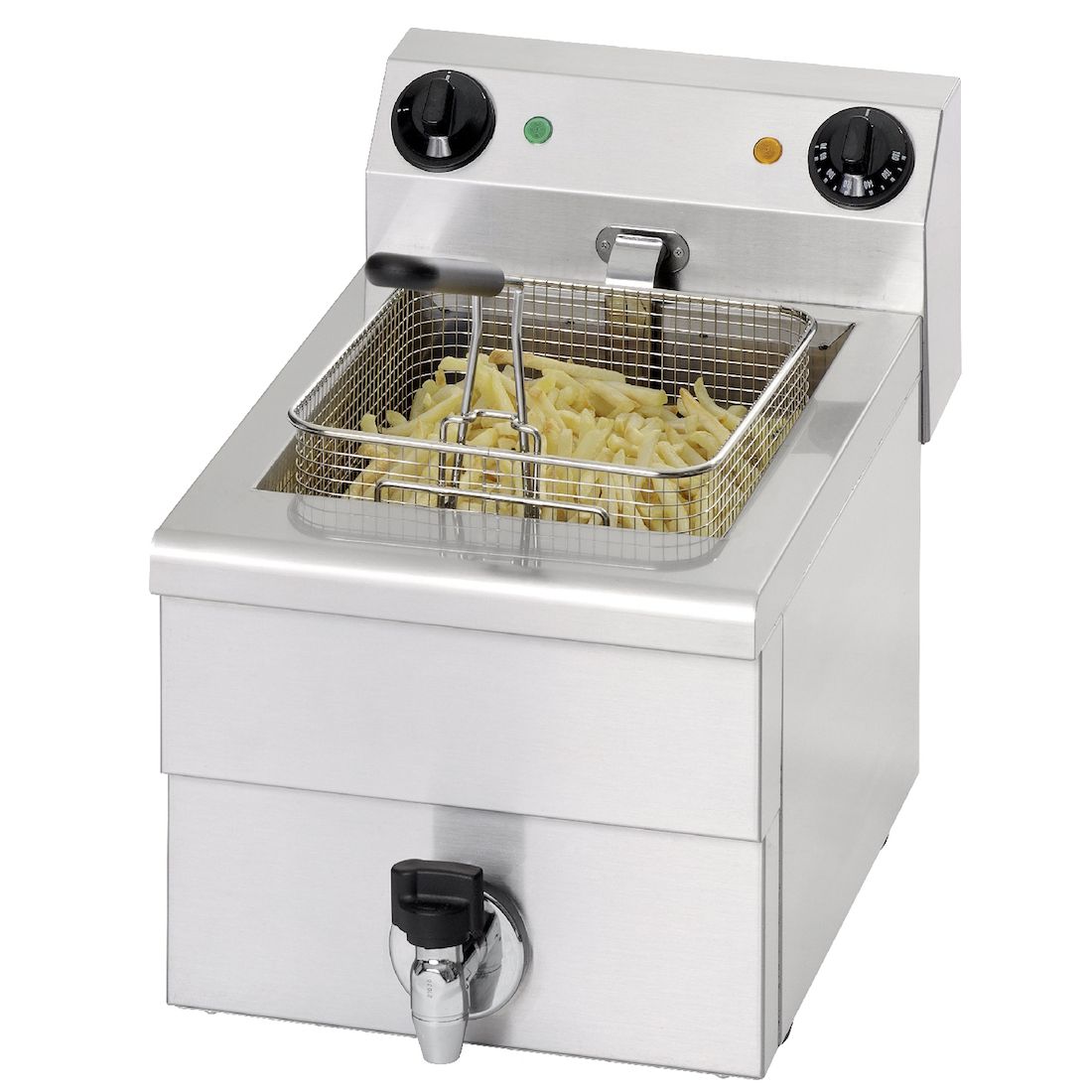 Friteuse électrique de table avecrobinet de vidange et équipée d'une cuve à capacité de 10 litres.