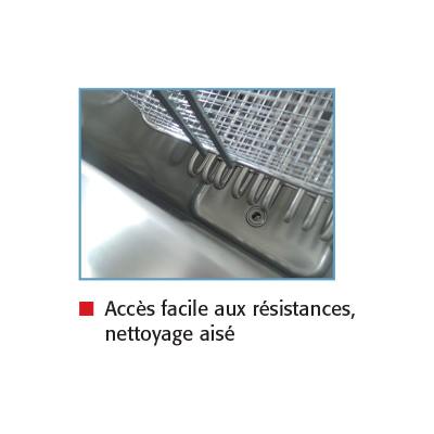 La cuve emboutie en inox réduit les angles et les zones de rétention, ce qui simplifie le nettoyage et améliore l’hygiène. La zone froide au fond de cuve limite la carbonisation des résidus: l’huile reste plus claire plus longtemps, les saveurs sont nettes, et l’aspect des produits reste constant tout au long du service.