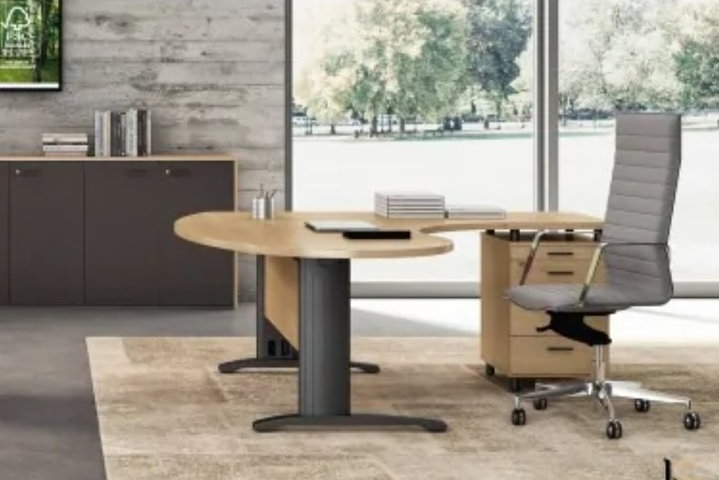 C'est un bureau d'angle équipé d'un caisson permettant de créer un espace du travail original et contemporain.