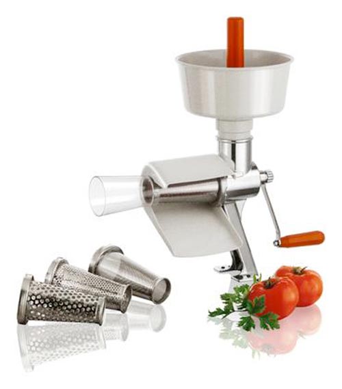 Ce moulin à tomates est conçu pour collecter le jus et la pulpe des tomates sans peaux ni pépins.