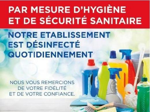 Valorisez l’engagement de votre établissement pour l’hygiène et la sécurité sanitaire grâce à notre panneau d’information “Établissement désinfecté”.