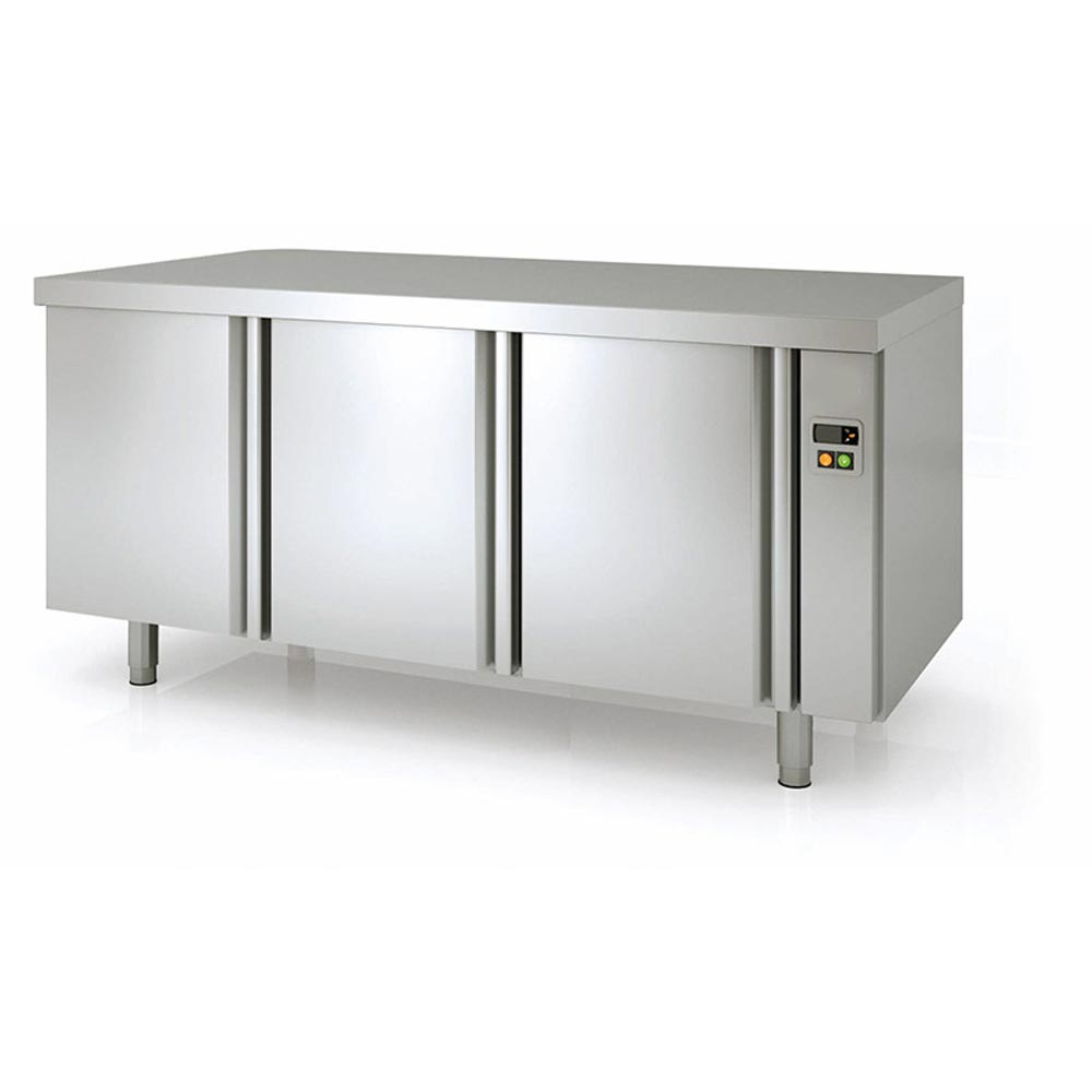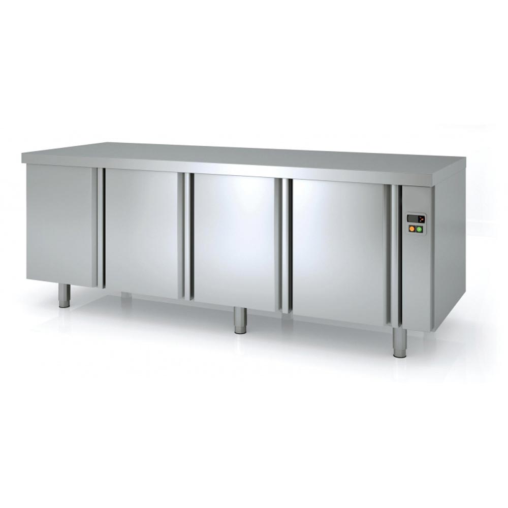 Sa table en inox permet de travailler les préparations et ses armoires permettent de stocker les denrées les composant.