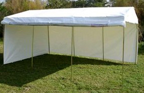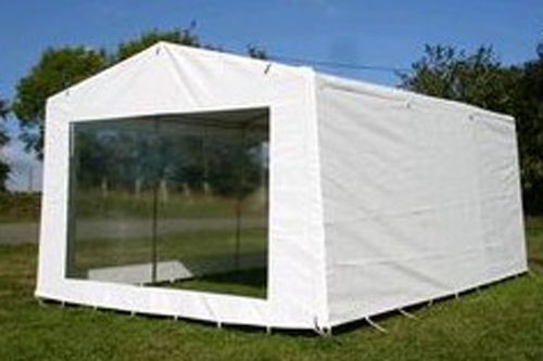 Tente en toile pour activités collectives, simple et légère en pignon et avec un côté cristal relevables rapidement monté. Cette tente est idéale pour
