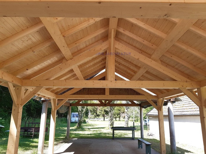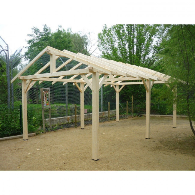 - Structure : Poteaux en bois contrecollé section 120 x 120 mm ou 160 x 160 mm. Poteaux livrés avec platines métalliques à fixer au sol dur.
