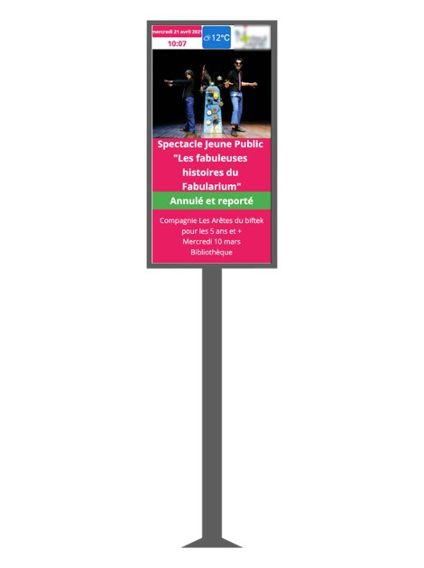 Ces panneaux d'affichage permettent d'alerter, de diffuser de l'information légale, touristique et événementielle. Les diffusions peuvent être programmée ou en temps réel. Le panneau LED est une solution peu énergivore qui entre dans une démarche éco responsable. Il dispose d'une luminosité adaptative pour une expérience utilisateur optimale.