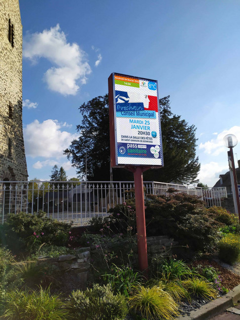 Bonjour, Nous avons un projet d"aménagement des abords de la mairie. Nous envisageons de remplacer la vitrine d"affichage papier des actes et arrêtes officiels par un panneau d"information numérique.