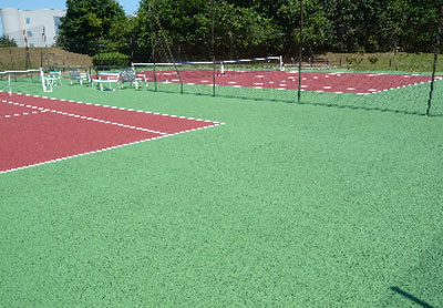 - fourniture et pose de 440 ml de bande couleur sol (recouvrement des lignes de tennis 150ml, de volley 75ml, et des ancien terrain de badminton 215 ml)