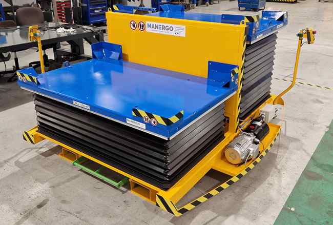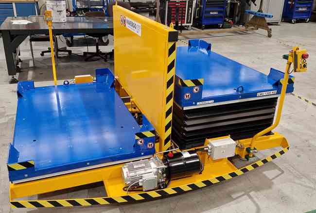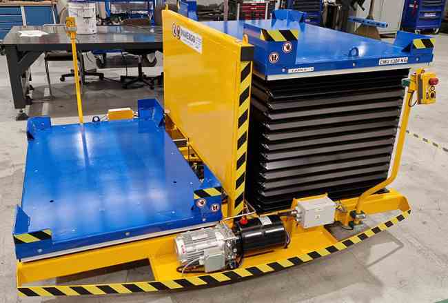 Les 2 tables élévatrices hydrauliques ont une capacité de 1300 kg chacune et une élévation de 1140 mm du sol.