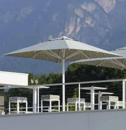Parasol géant télescopique choisi par le secteur CHR qui recherche une grande couverture, solidité, fiabilité, fonctionnalité.