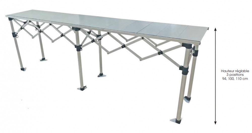 Le stand buvette avec comptoir pliable et réglable en aluminium est livré avec 3 comptoirs qui forment un linéaire de service continu.