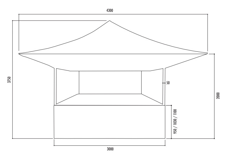 L’ensemble offre une couverture totale de 430 x 430 cm, avec une buvette de 300 x 300 cm. La hauteur est de 3750 mm, ce qui procure un volume intérieur confortable, évite la sensation d’écrasement et facilite l’installation de signalétique haute ou d’éclairage complémentaire sous le toit.
