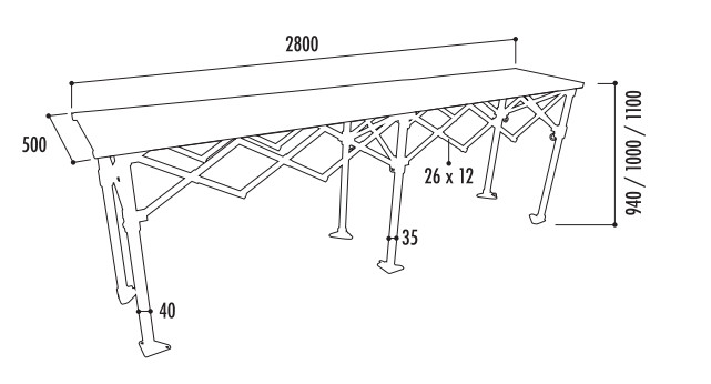 Chaque comptoir dispose d’une structure en aluminium anodisé avec un piètement extérieur hexagonal Ø 28 mm, un piètement intérieur carré 24 x 24 mm et un croisillon de section 20 x 10 mm.