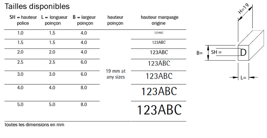 largeur des lettres de 2.2mm (largeur poinçon 3mm)