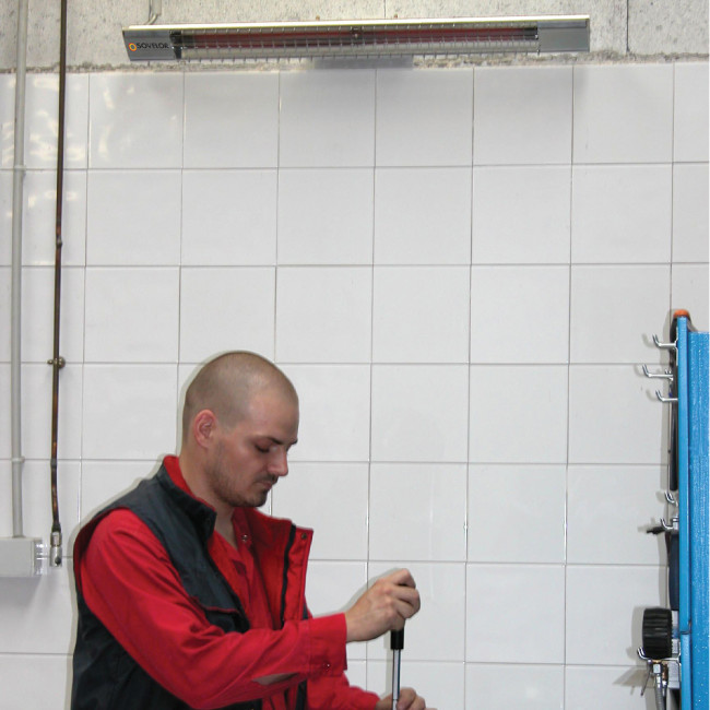 Cette installation en hauteur libère entièrement votre espace au sol et permet un chauffage ciblé de vos zones de travail.