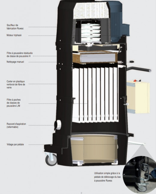 - Utilisation simple grâce à la pédale de déblocage du bac à poussière Ruwac