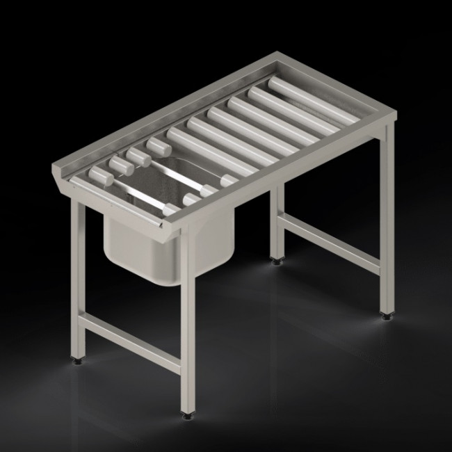 - Dessus inox avec chemin de glissement à rouleaux d’une largeur de 540 mm et pente intégrée pour écoulement