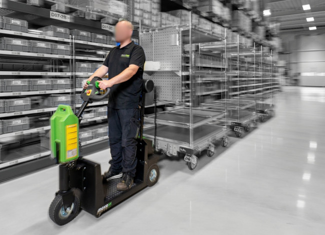 Le T-1000 plateforme est une variante debout du t-1000 et idéal pour une utilisation sur de plus longues distances. Ce train logistique peut facilement déplacer des chariots, des chariots industriels ou des bases roulants sur roues, sans que vous ayez à effectuer d'exercice physique. Le Movexx t-1000 platforme dispose d'un système de batterie interchangeable. Une batterie vide peut être facilement changée en retirant la batterie du support et en insérant une batterie chargée.